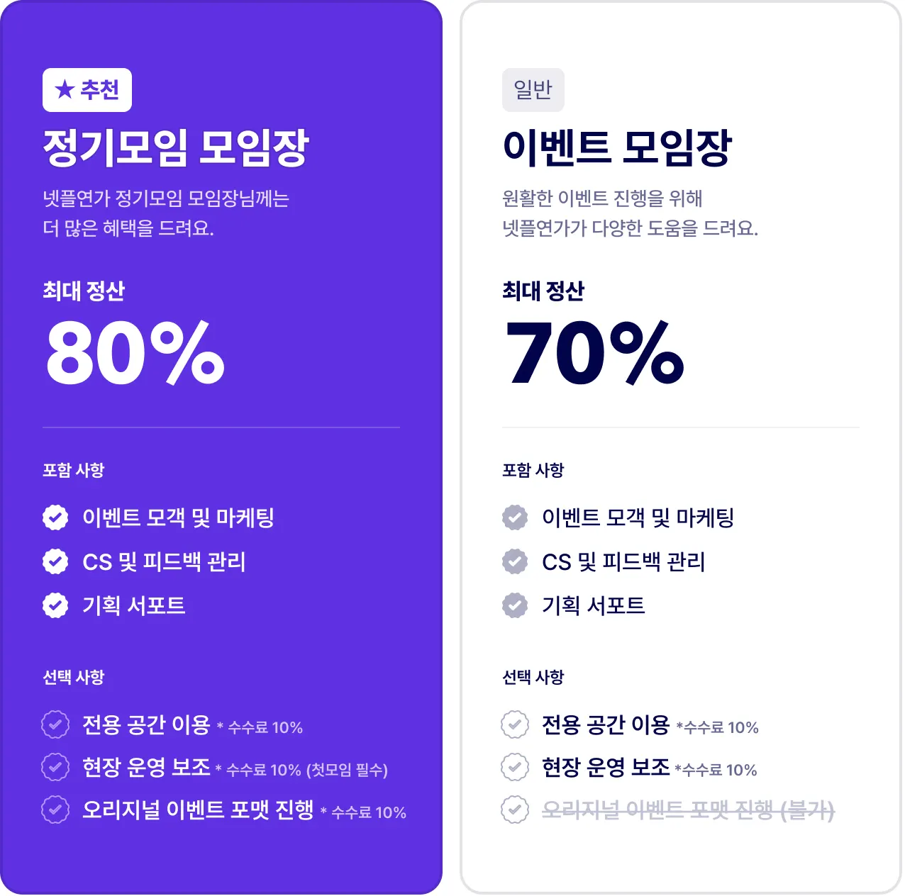 이벤트 가격은 넷플연가 멤버와 비멤버 가격을 별개로, 20~30% 차이를 두어 책정해야 해요. 홍보 및 모객이 비교적 용이하고 넷플연가 멤버십 내 콘텐츠를 소개할 수 있는 장점이 있어요.